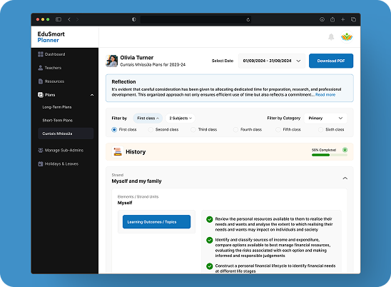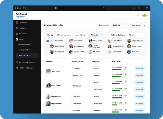 Manage long-term, short-term, and Cuntais Mhíosúla lesson plans.